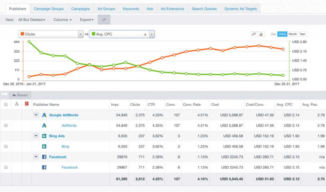 Clickable doesn’t have automated bid management features. But by concentrating on ROI-related data, you can scan and see how your PPC campaigns are performing, and make any bid adjustments to improve performance.