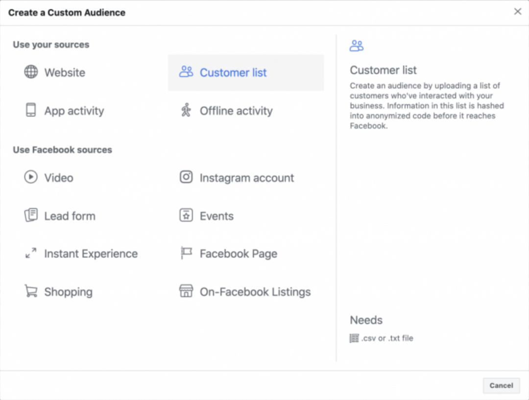 As you can see, there are several other ways to create a source audience. In this article, we’re focusing on customer lists, as this allows you to combine data from the multiple sources outlined above, and know exactly who’s included in your source audience.