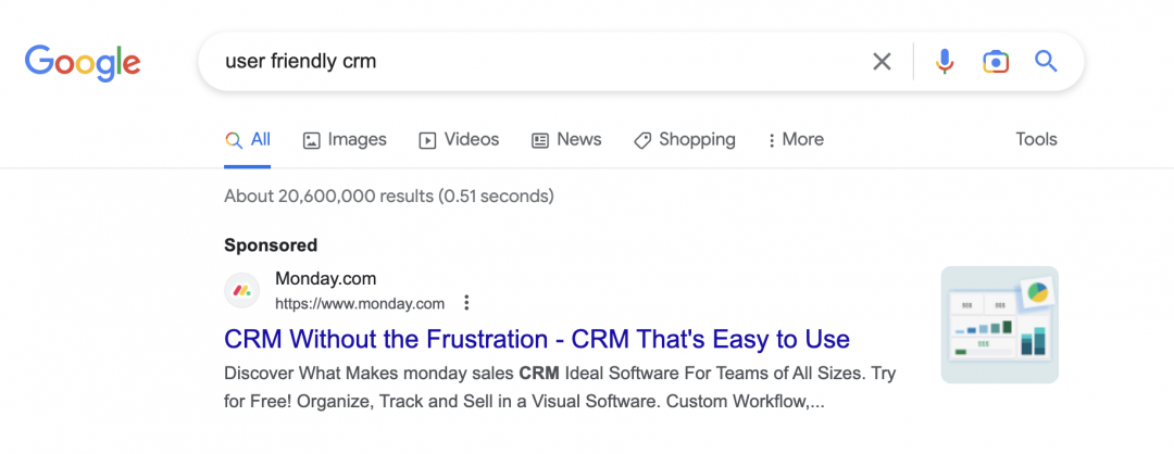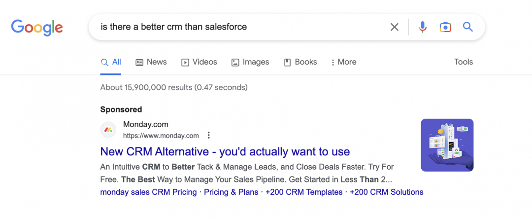 As an example, Monday.com doesn’t just target people looking for a CRM. Instead, it targets users specifically searching for an alternative to more complex CRM systems with tailored messaging for each: