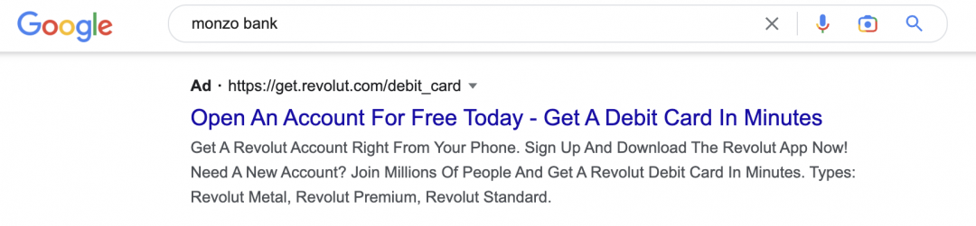 Bidding on competitors’ branded keywords is another common tactic. Here’s an example of other brands’ ads being served on a search for “monzo bank”: