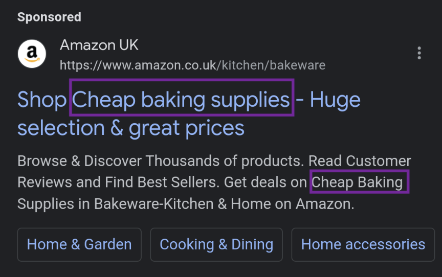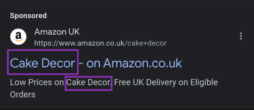 Dynamic keyword insertion can make sure the search keyword appears in your ad. Amazon uses this across its range: