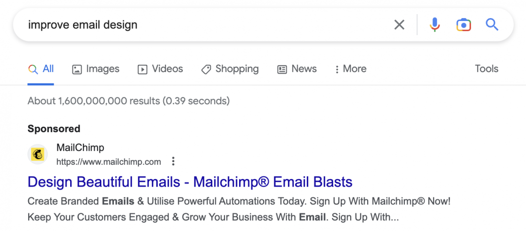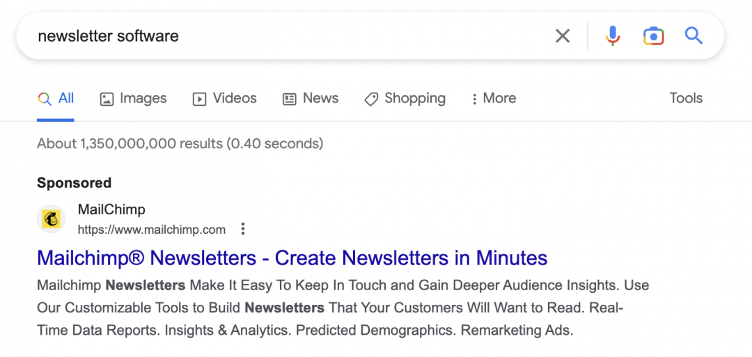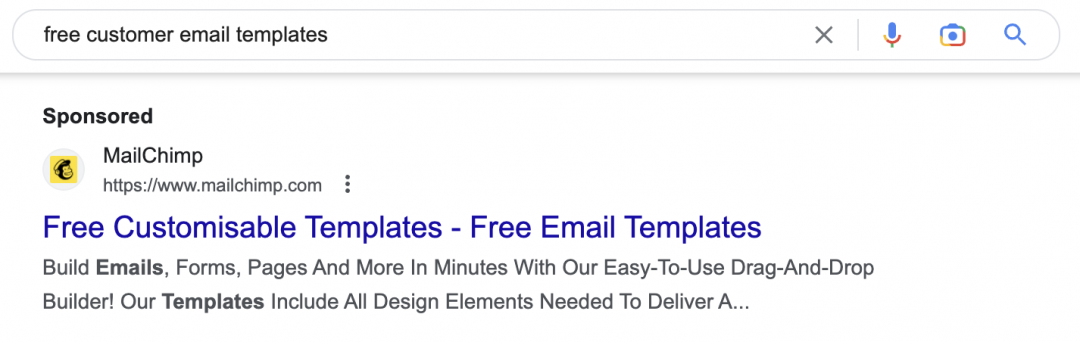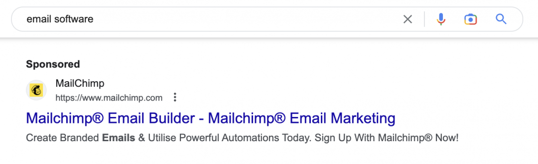 See how Mailchimp’s ad headlines reflect the user’s search intent, thanks to the range they’ve included in their RSAs: