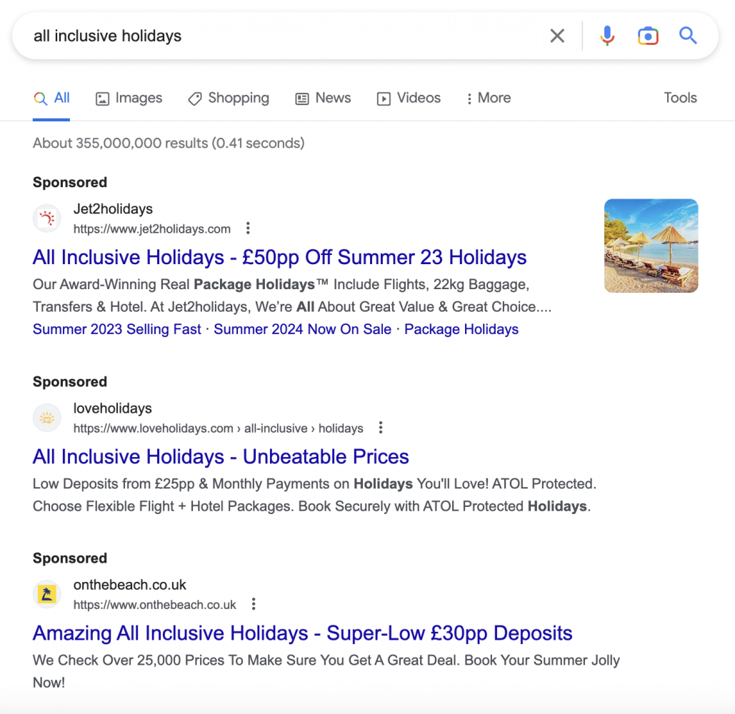 While all three ads are clearly relevant to the search term, Jet2 and On The Beach have a clearer, more distinctive offer than Love Holidays: