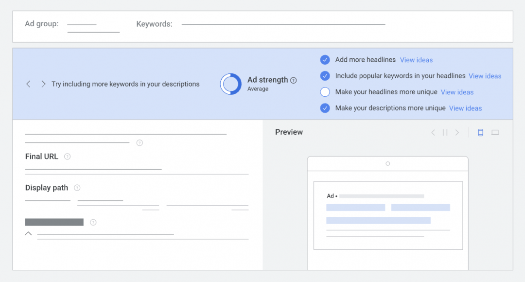 However, RSAs give you more space to add compelling headlines and descriptions than ETAs did. You just can’t show them in a specific order, or link them to a specific exact match keyword.